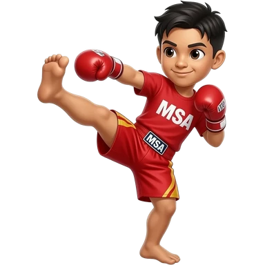 Thai boxer front kick teep red shorts and red t shirt with msa logo emoji