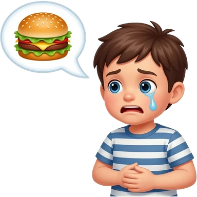 kid sad but not crying holding tummy hungry with bubble at the top with burger emoji | AI Emoji Generator