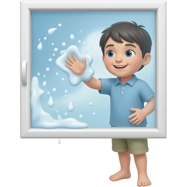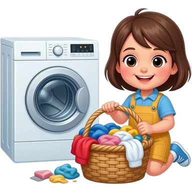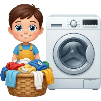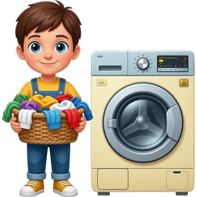 a kid with a basket full of dirty clothes and next to the washing machine emoji