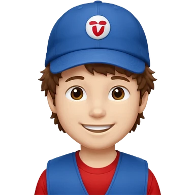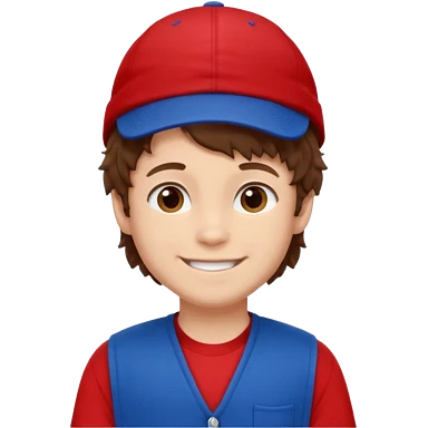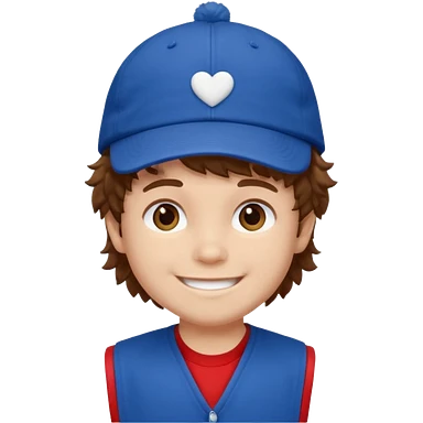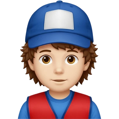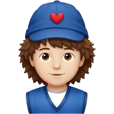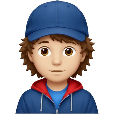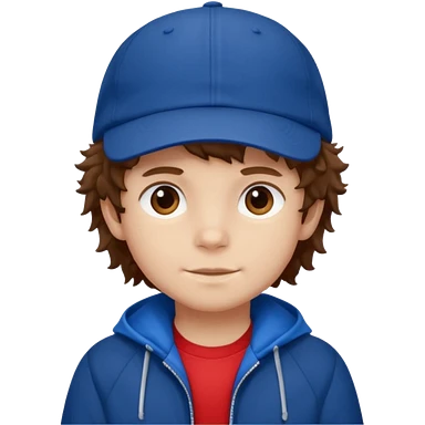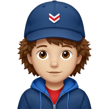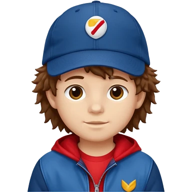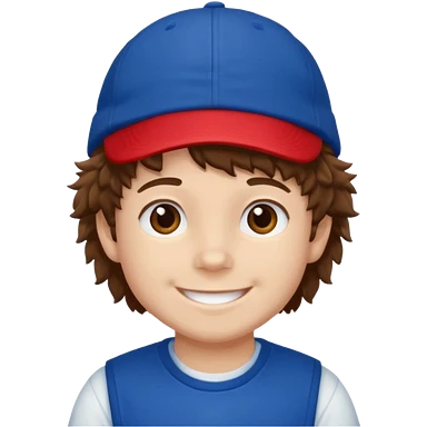 brown fluffy hair kid with blue and white cap dark blue jilet red t shirt emoji