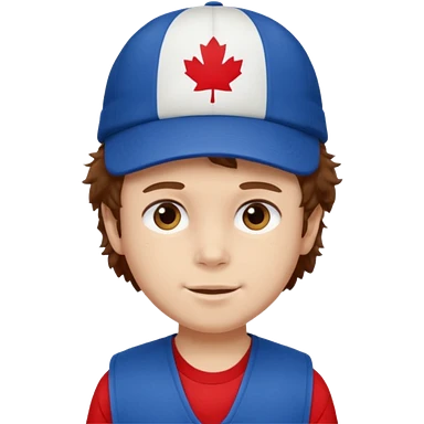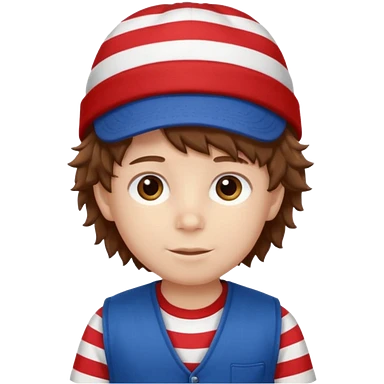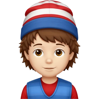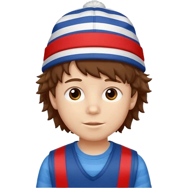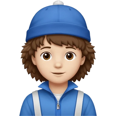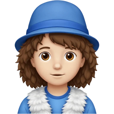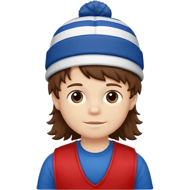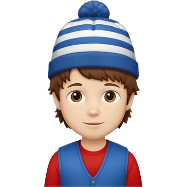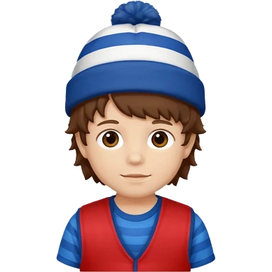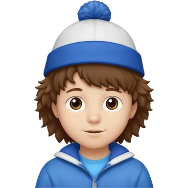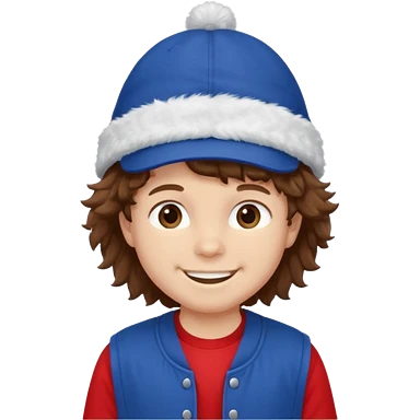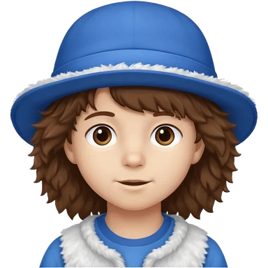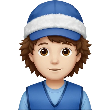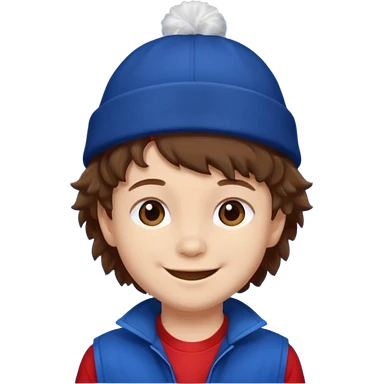 brown fluffy hair kid with blue and white hat dark blue jilet red t shirt emoji