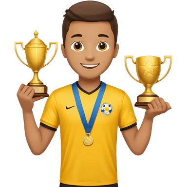 happy soccer player with a first-place medal and a trophy in yellow t-shirts emoji