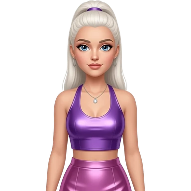 Kimberly Wyatt with blue eyes, long white blonde straight high ponytail hair, purple metallic halter crop top, pink metallic long skirt, necklace and earrings emoji