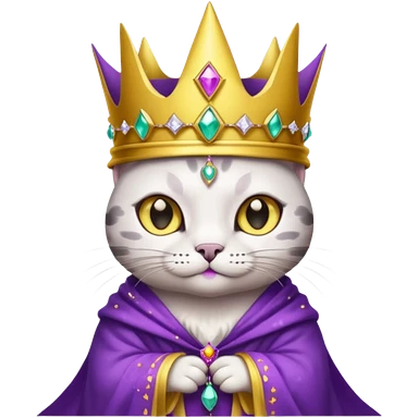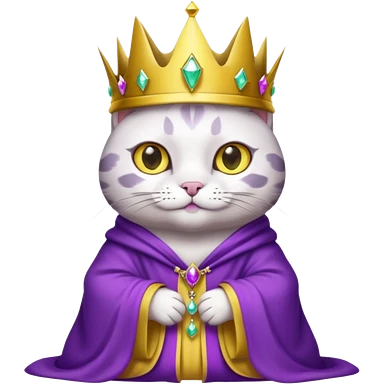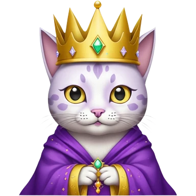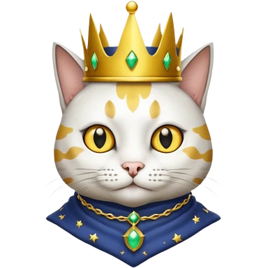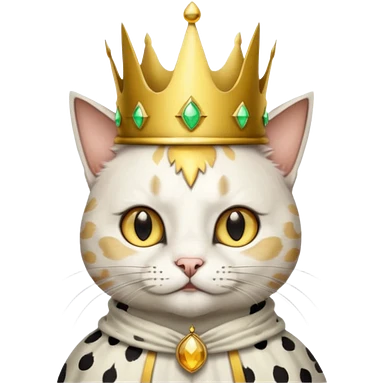 A wizard king cat that is mostly white with black spots and yellow eyes emoji
