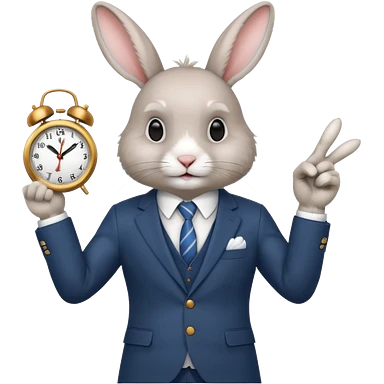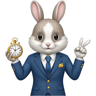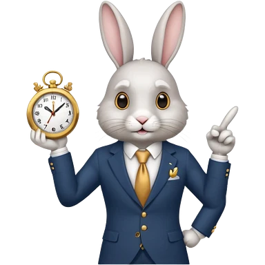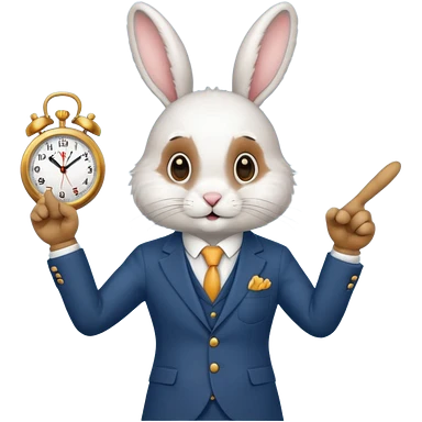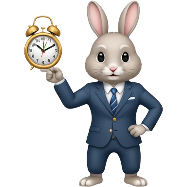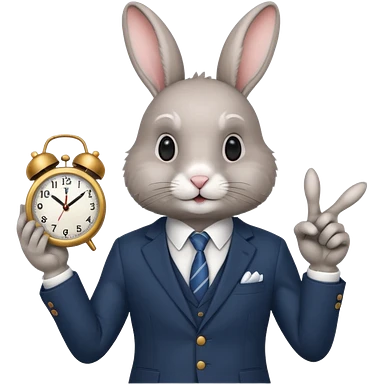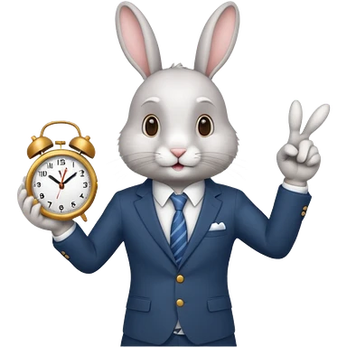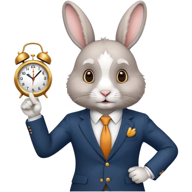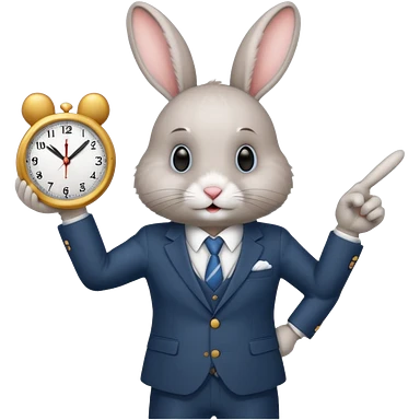 A rabbitwearing a suitand holding a clockand pointing at the clock emoji