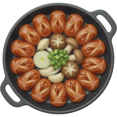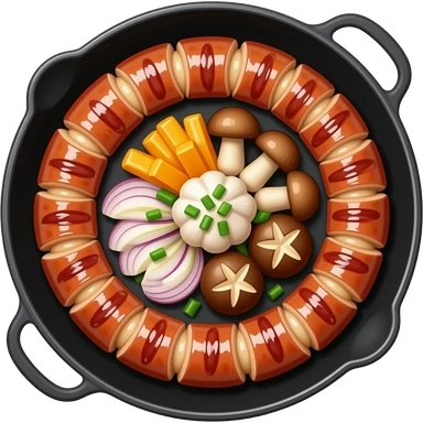 korean gopchang platter, grilled intestines arranged in a circle, garlic, king oyster mushrooms, onions, chives, glossy oil texture, black pan, top view, warm lighting, realistic food photography emoji