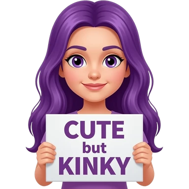 girl with long purple hair holding a CUTE but KINKY sign emoji