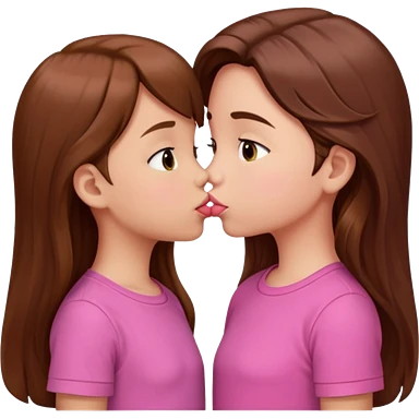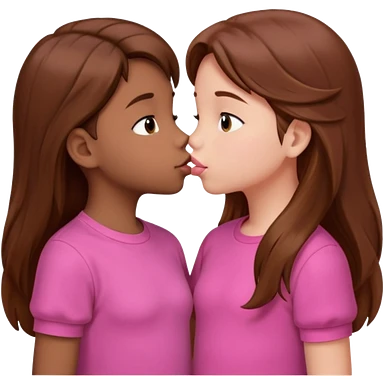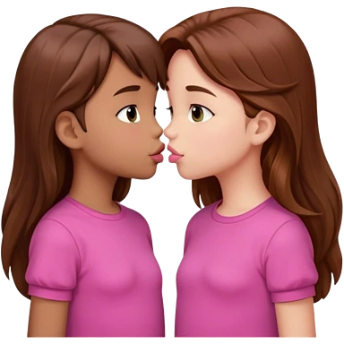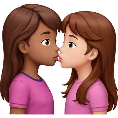 two 5 year old gals about to kiss on the lips, lips extremely close but not touching, pink shirts, long brown hair emoji