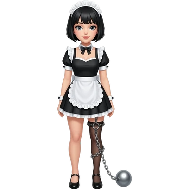 female maid, black pixie cut hair, ball & chain attached to leg emoji