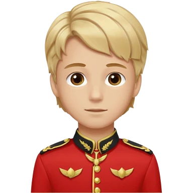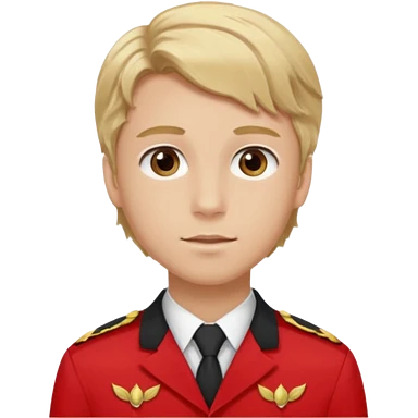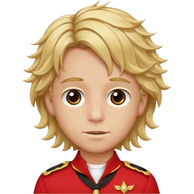 SARI SAÇLI SAÇININ YARISI SOLA DOĞRU DİĞERİNİN SAĞ TARAFTA AMA DÜZ DURAN KAHVERENGİ GÖZLÜ UZUN KİRPİKLİ BUĞDAY RENKLİ KIRMIZI ÜNİFORMALI BİR ERKEK ÇOCUK emoji