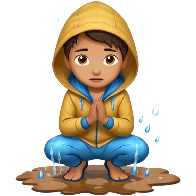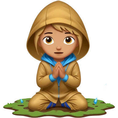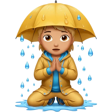 Character kneeling as rain hits the ground, one drop splashing exaggerated emoji