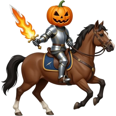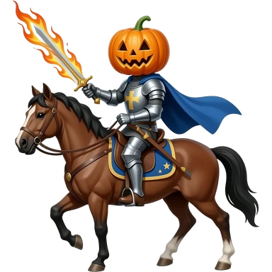 Knight riding a horse with a flaming sword and his head is a pumpkin emoji