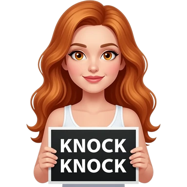 sexy girl with long wavy ginger hair and ginger eyes wearing a white tanktop is holding a black colored sign with KNOCK KNOCK written on it emoji