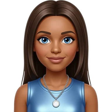 Kobe from Bratz with blue eyes, brown hair, periwinkle metallic sleeveless shirt, silver necklace emoji
