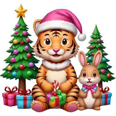 Smiling Pink tiger with Santa sitting with a bunny as friends and brightly lit colorful Christmas trees and candy canes 🎁 emoji