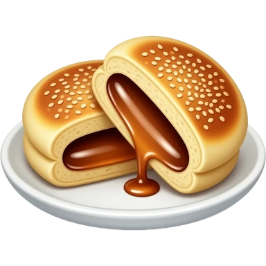 Korean hotteok, two pancakes, cut open, visible syrup filling, glossy brown syrup, crispy golden surface, sesame seeds, white plate, clean background, studio lighting emoji