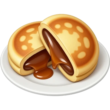 Korean hotteok, two pancakes, cut open, visible syrup filling, glossy brown syrup, crispy golden surface, white plate, clean background, studio lighting emoji
