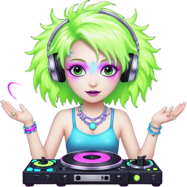 korean-techno-dj-girl,-wearing-a-stylish-edgy-outfit-with-metallic-chains,-long-black-hair,-performing-in-a-neon-lit-underground-club,-cyberpunk-aesthetic,-high-detail-3d-emoji-style,-energetic-and emoji | AI Emoji Generator