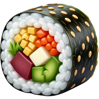 Korean tuna gimbap, realistic, sliced roll, tuna filling, colorful vegetables, sesame oil shine, sesame seeds, clean background, studio lighting emoji | AI Emoji Generator