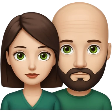 Man beard bald white dark green eyes, woman medium hair brown brown eyed latina, they have different eye color man dark green woman dark brown emoji