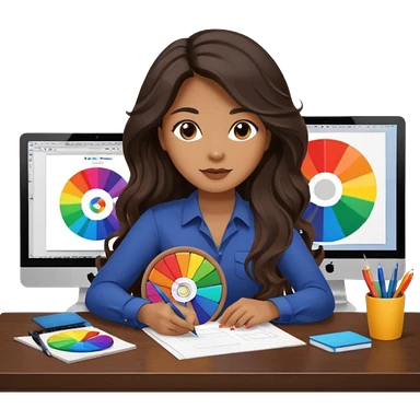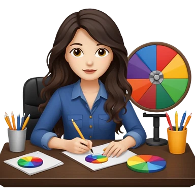 female dark wavy long hair graphic designer , big color wheel behind , pens, papers, desktop emoji