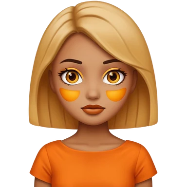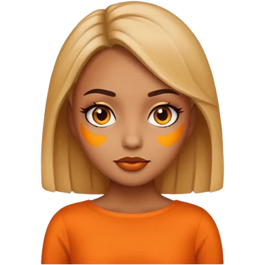 A girl tan skin face emoji with skin head styled, dramatic makeup and an orange dress. emoji