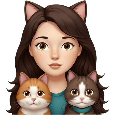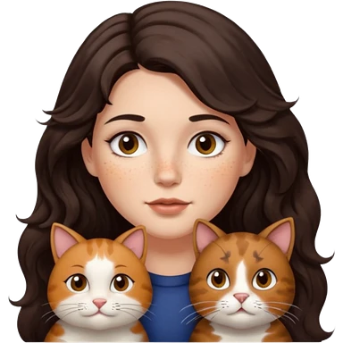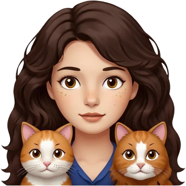 Uzun koyu kahverengi dalgalı saçlı, çenesinde beni olan ve yüzünde biraz çiller olan, iri koyu kahverengi bol kirpikli gözlü sevimli bir yüzü katlı kesim bir saçı olan kadın yap yanına da kilolu kahverengi bir kedi yap emoji