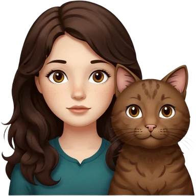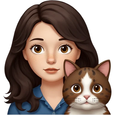Uzun koyu kahverengi dalgalı saçlı, çenesinde beni olan ve yüzünde biraz çiller olan, iri koyu kahverengi bol kirpikli gözlü sevimli bir yüzü katlı kesim bir saçı olan kadın yap yanına da kilolu tamamen kahverengi bir kedi yap emoji