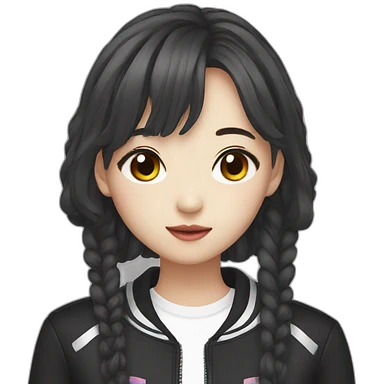 pale girl who is a kpop idol woth pastel kawaii clothes whote and pink and black hair brown eyes and bows emoji