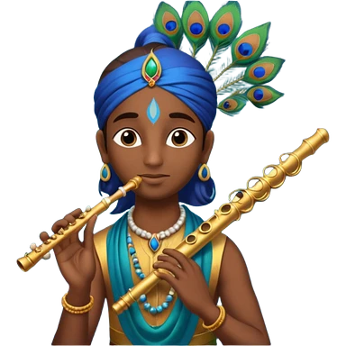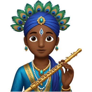 Krishna with blissful expression, eyes closed, playing flute, blue skin, peacock feather in hair, emoji style emoji