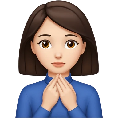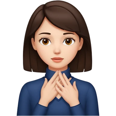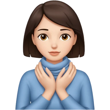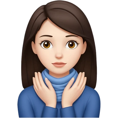 a brunette woman with two hands wrapped opposite around her neck emoji