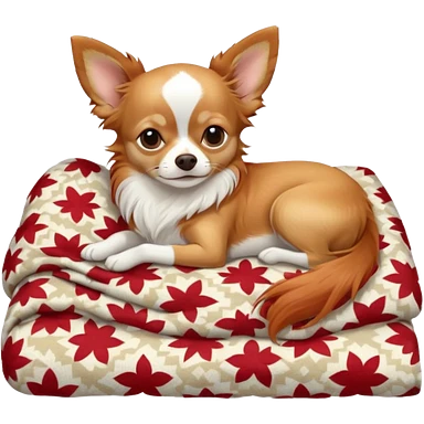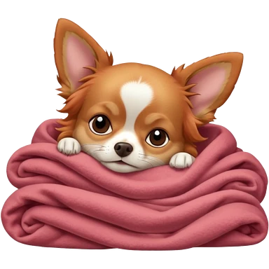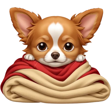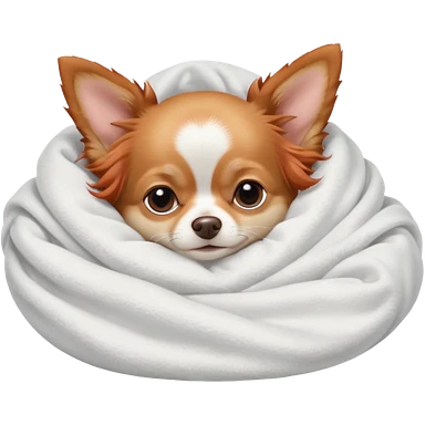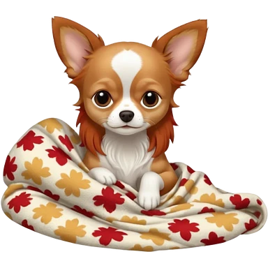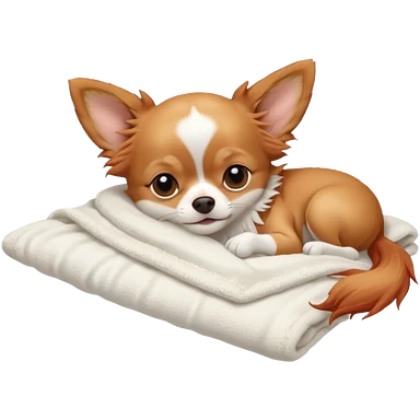 Long haired chihuahua, beige/redhaired with white chest and white socks, sleeping cutely under blanket emoji
