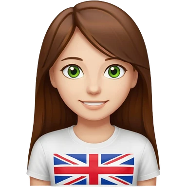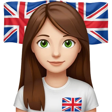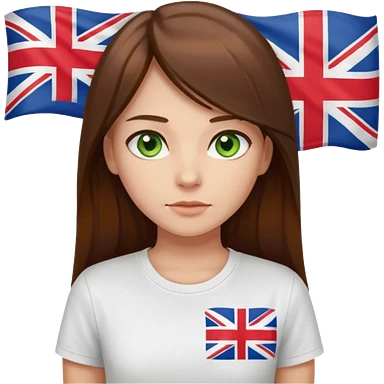 Una chica con pelo liso, largo y marrón. Ojos verdes, camiseta blanca con una bandera de Reino Unido. emoji