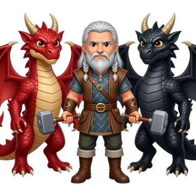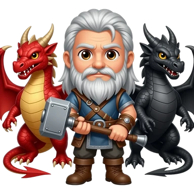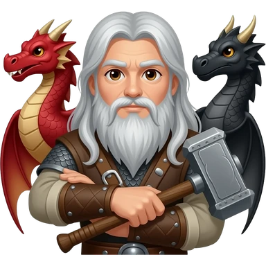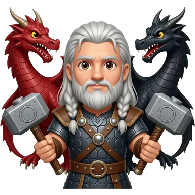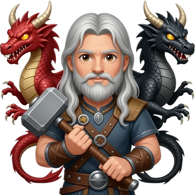 la même image mais les yeux brun et les cheveux et la barbe de couleur argenté. un viking aux cheveux long et une barbe moyenne argenté avec un marteau à deux main sur lequel repose ses deux mains. Ce viking est entre deux dragons, l'un est rouge et l'autre est noir . emoji