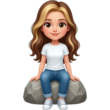 una chica sentada en una roca, es grande i tiene el pelo largo i castaño con un poco de rubio mezclado emoji