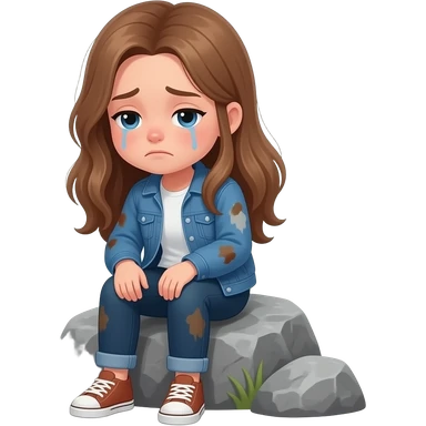 una chica sentada en una roca, i tiene el pelo largo de color avellana esta cansada tiene un peto azul manchado emoji