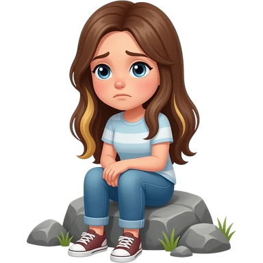 una chica sentada en una roca, i tiene el pelo largo i castaño con un poco de rubio esta cansada emoji