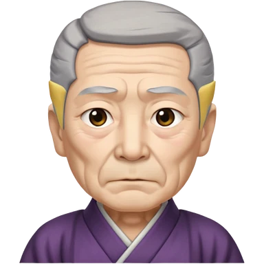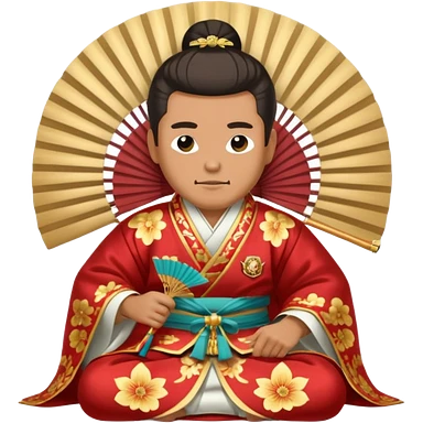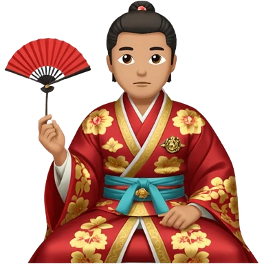 Wealthy warlord in ornate kimono, crest on chest, seated with fan in hand. emoji