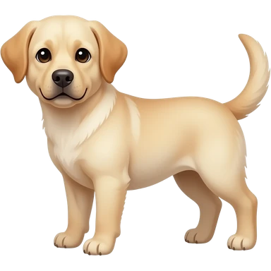 Smiling girl with long dark wavy brown hair and red glasses next to a small shaggy beige Labrador dog emoji