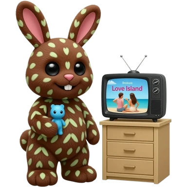 Fluffy Bunny plush with creepy terrh that is chocolate with pistachio khatifi Dubai in it holding a blue 67 and watching the show love island emoji