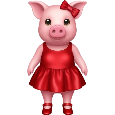 PORQUINHO FEMININO COR-DE-ROSA DE 4 PATAS+4 ANOS DE IDADE OLHANDO PARA FRENTE E USANDO 1 VESTIDO PET DE CETIM LISO VERMELHO, 1 LAÇO DE CETIM LISO VERMELHO NA ORELHA DIREITA E 4 SAPATOS VERMELHOS NAS 4 PATAS SEM DATA+HORÁRIO emoji