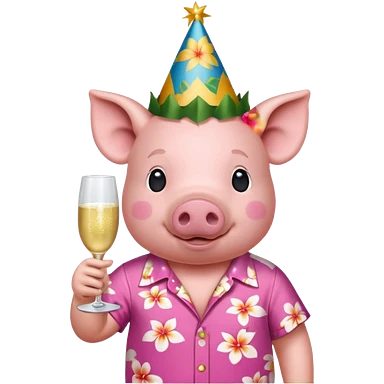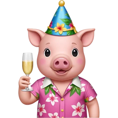 Pig with aloha shirt, birthday hat, champagne glass emoji