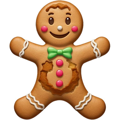 { "type": "object", "look": "gingerbread man, icing smile, cookie texture, front view", "description": "a cheerful gingerbread cookie shaped like a man, smiling with white icing details" } emoji