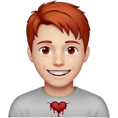 парень с красно-русыми волосами; бледная сероватая кожа; белые глаза; открытая улыбка, где на зубах кровь; одет в белый свитер emoji