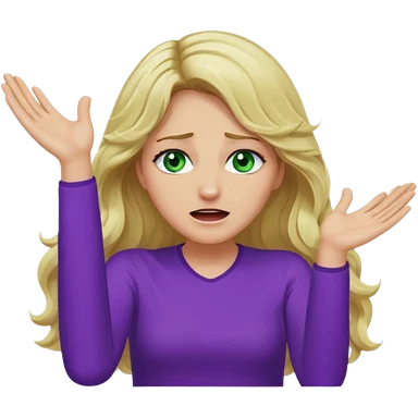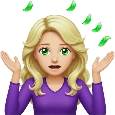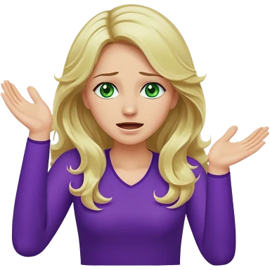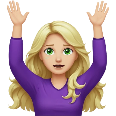 lady with long wavy blonde hair, purple top, green eyes, throwing her hands in the air crying emoji