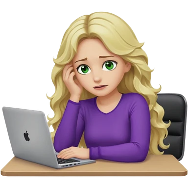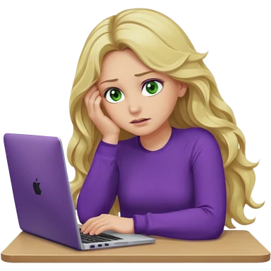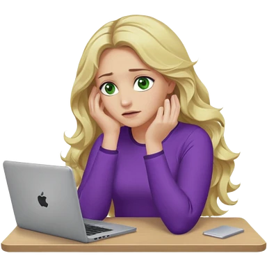 lady with long blonde wavy hair, purple top, green eyes,one elbow one desk hand on face with a laptop looking defeated emoji