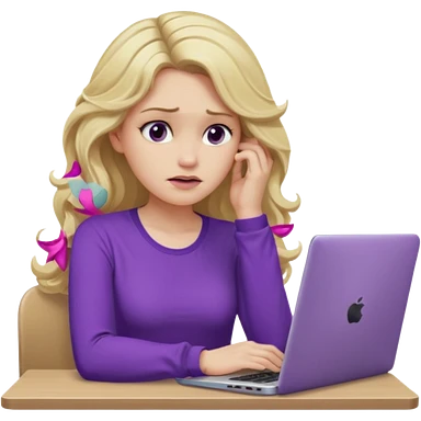 lady with long blonde wavy hair, purple top throwing her with a laptop looking defeated emoji