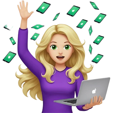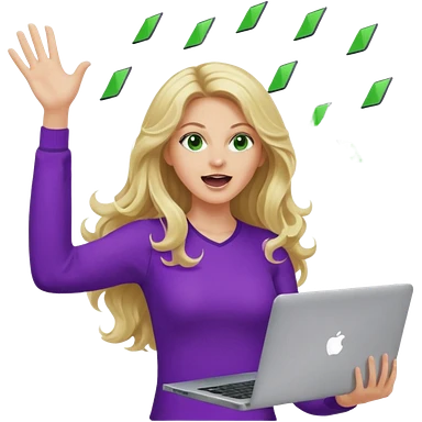 lady with long blonde wavy hair, purple top, green eyes throwing her with a laptop hands in the air screaming emoji