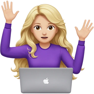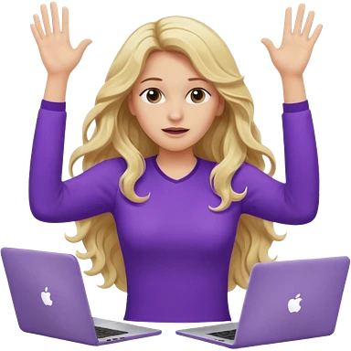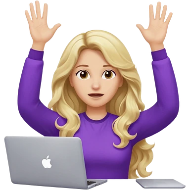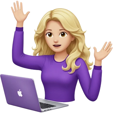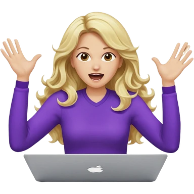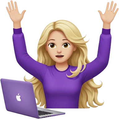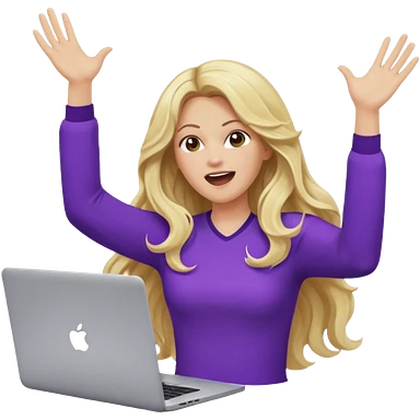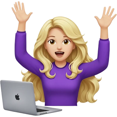 lady with long blonde wavy hair, purple top throwing her with a laptop hands in the air screaming emoji