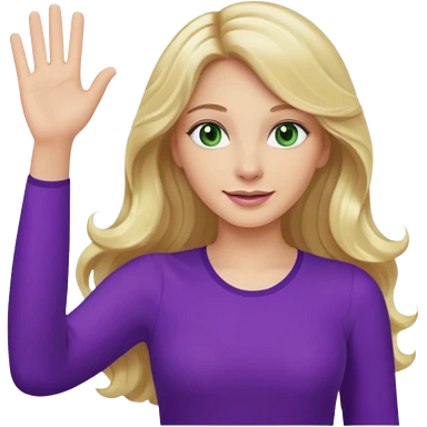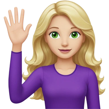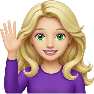 lady with long wavy blonde hair, purple top, green eyes, waving hello emoji